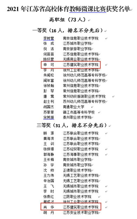 近日,江苏省教育厅公示了2021年江苏省高校体育教师微课教学比赛获奖名单,bevictor伟德官网申可、肖华两位老师分别获得高职组一等奖和三等奖。