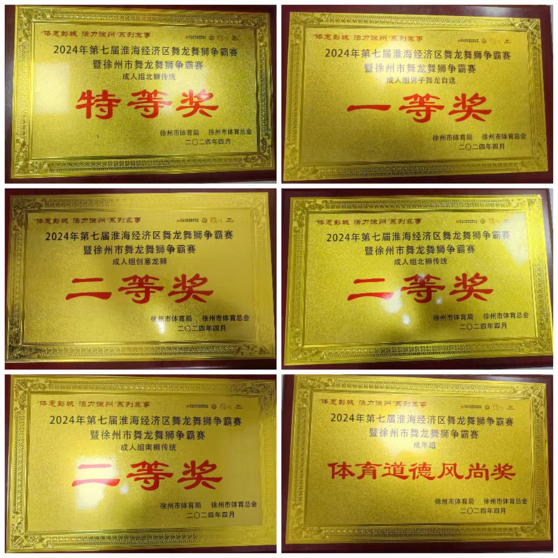 4月19日-21日,由徐州市体育局、徐州市教育局、徐州市文化广电和旅游局、徐州市体育总会承办的2024年第七届淮海经济区舞龙舞狮争霸赛暨徐州市舞龙舞狮争霸赛在徐州市云龙区大龙湖亲水广场举行。公司龙狮队获成人组特等奖1项、一等奖1项、二等奖3项,并荣获成人组体育道德风尚奖。