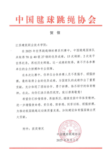 近日,公司收到来自中国毽球跳绳协会的贺信,祝贺公司学生在2025年世界跳绳锦标赛系列赛上所取得的突出成绩,以及公司多年来致力于跳绳运动的开展所作出的积极贡献。希望公司再接再历,继续发扬中华体育精神,刻苦训练、顽强拼搏,为推动我国跳绳运动高质量发展,加快建设体育强国做出更大贡献。